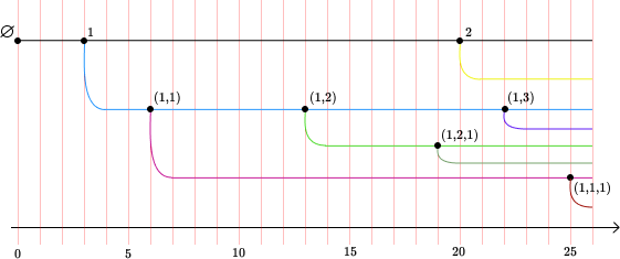 Les processus CMJ sont plus complexes. Dans ce modèle, les individus donnent naissance au cours de leur vie à plusieurs enfants, à des dates précises. Ceci change l’échelle de temps, qui compte plutôt les années que les générations, car ces dernières peuvent désormais se superposer. Ci-dessous, on a représenté un exemple d’évolution d’une population selon ce modèle. Chaque ligne colorée représente la vie d’un individu, et chaque individu est noté par un point. L’axe des abcisses représente le temps.