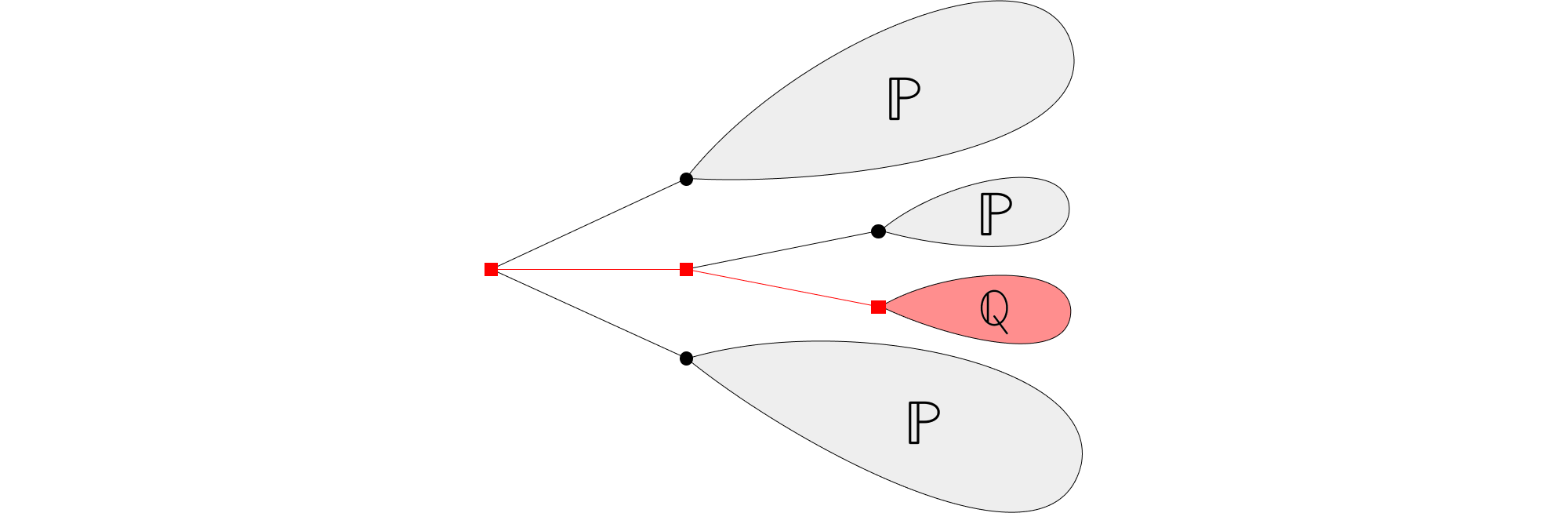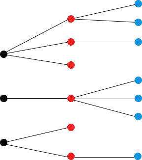 Partons d’un groupe d’individus, et imaginons qu’ils donnent naissance indépendamment les uns des autres à un nombre aléatoire d’enfants, suivant la même mesure de probabilité PP, puis meurent. Appelons ces individus la génération 0, et leurs enfants la génération 1. On peut recommencer le processus pour chaque individu de la génération 1, et obtenir la génération 2, et ainsi de suite. Les processus de Galton-Watson modélisent ce genre de situation. C’est-à-dire que les générations sont séparées, les individus ne se reproduisent pas entre eux, mais donnent naissance tous seuls à des enfants (on parle de reproduction asexuée), et ce une seule fois dans leur vie. Un outil utile pour visualiser l’évolution d’un tel processus est un arbre aléatoire. Ici, la génération 0 est représentée en noir, la première en rouge et la seconde en bleu.